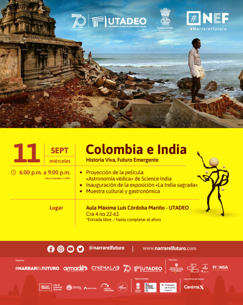 En este encuentro, #NarrarelFuturo rinde homenaje a la India como un faro cultural que ilumina el camino hacia un futuro que se nutre de su rica herencia, invitándonos a redescubrir lo que significa narrar desde el corazón del tiempo. Están todos invitados a disfrutar una programación fascinante liderada y organizada por la Embajada de la India en Colombia, la Facultad de Ciencias Sociales de la Universidad de Bogotá Jorge Tadeo Lozano y #NarrarElFuturo.