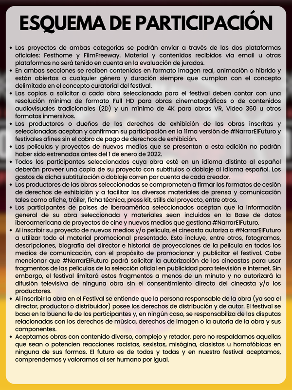 Una pregunta que surge año a año alrededor de la curaduría y concepto general de nuestro festival es ¿Qué es realmente el futuro? y las respuestas que vamos encontrando siempre nos llevan a más y mejores preguntas, alimentando nuestra curiosidad y deseo de explorar lo desconocido. El futuro es aún un escenario por pensar, construir y relativizar de manera colectiva. Para nosotros como #NarrarElFuturo, el futuro es un lugar de pensamiento, de construcción, un lugar físico y digital que se narra desde el pasado y desde el presente, un lugar inexplorado, caótico, fragmentado y al mismo tiempo mágico y poderoso. Una plataforma de encuentro para la expresión de visiones, historias y perspectivas relacionadas con lo que está por venir y en donde la creatividad y la imaginación son nuestras brújulas, permitiéndonos abordar temas futuros desde ángulos tecnológicos, sociales, culturales y medioambientales.
