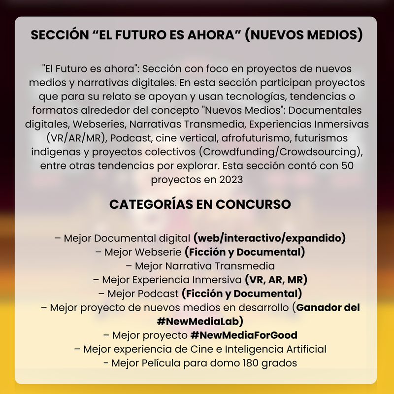 Es un punto de encuentro de exhibición, formación e industria en el que se reúnen profesionales de la industria local, nacional y regional interesados en la realización cinematográfica y audiovisual en sus más recientes e interesantes tendencias narrativas y técnicas dentro del entorno digital; el transmedia, el documental web e interactivo, la realidad virtual (VR/AR/XR), las webseries, la inteligencia artificial, los futurismos, las narrativas y la financiación colectiva (Crowdsourcing/funding), el video vertical y otros conceptos del cine y los nuevos medios son algunos de los ejes temáticos del Festival.
